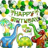 • 1 juego de pancarta de cumpleaños de dinosaurio + 4 globos de aluminio de dinosaurio de 36 pulgadas + 1 globo de árbol de coco de 41 pulgadas + 55 globos de látex mate coloridos de 12 pulgadas (5...