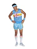 - JUMPSUIT: Este disfraz Ken Deportista para hombres incluye pantalones cortos deportivos azul eléctrico con ribete amarillo y logo Ken rosa metalizado, camiseta sin mangas con el emblema de Ken...