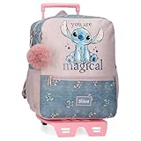 ToyBags Mochila Escolar Stitch Tropical - Doble Compartimento - con Accesorio Pom-Pom - Adaptable + Carro Rosa Proteccion Lateral Y STOPER Frontal Anti CAIDA 4 Ruedas giratorias - 44 X 30 X 20 CM